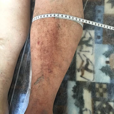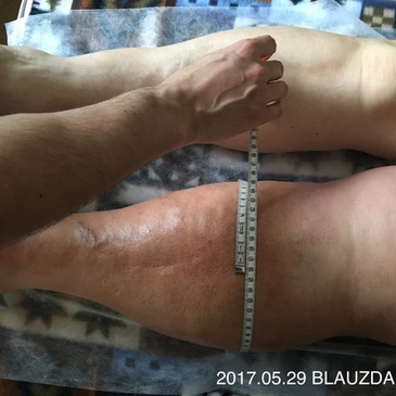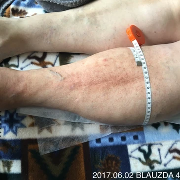 60 m. moteris skundėsi kairės kojos tinimu, kuris tęsiasi nuo 2016 m. sausio mėn. Pacientei buvo atlikta chemoterapija ir spindulinė terapija kairės kirkšnies limfmazgiams. Duobėtoji, negrįžtamoji limfedema pasireiškė po naujų metų.
